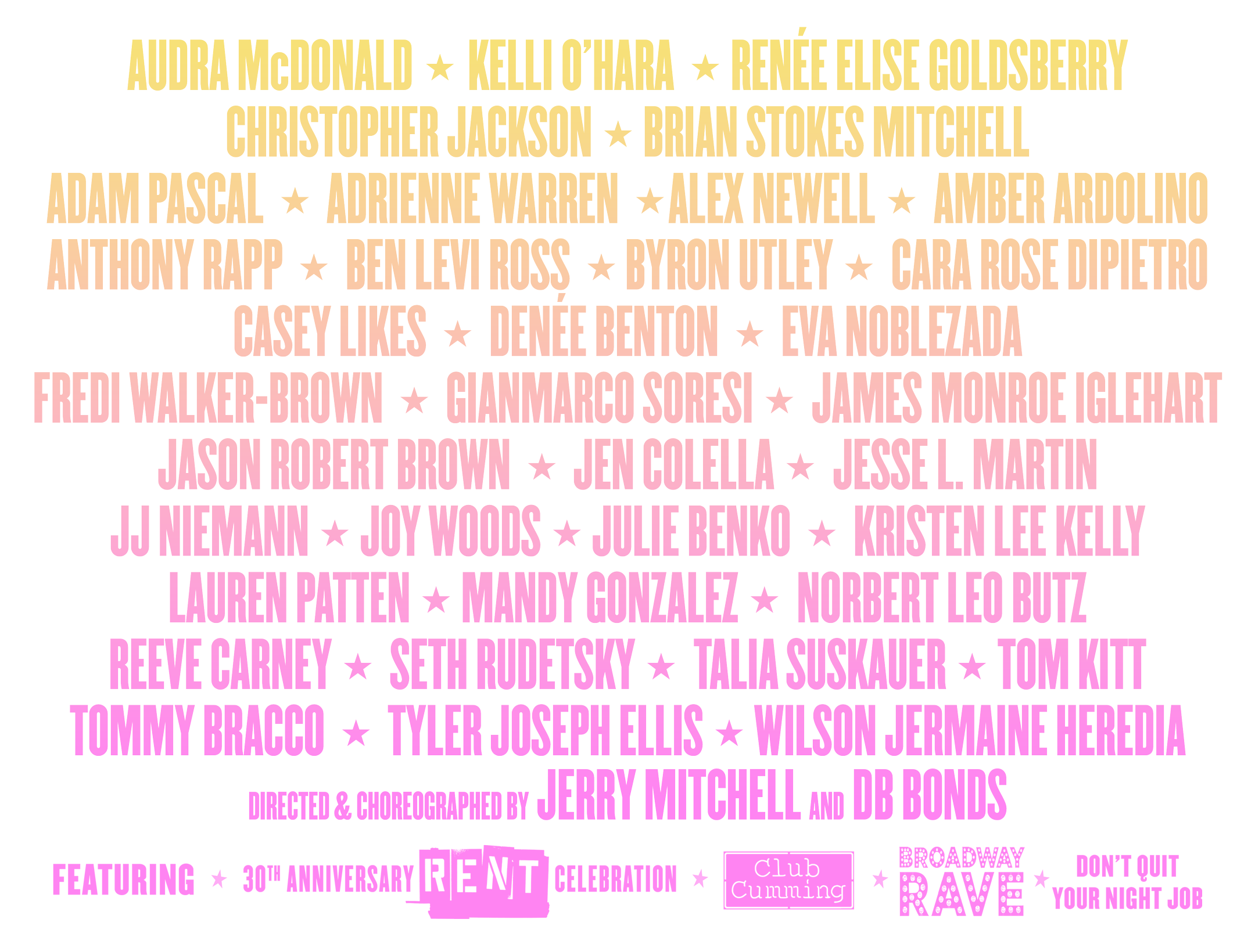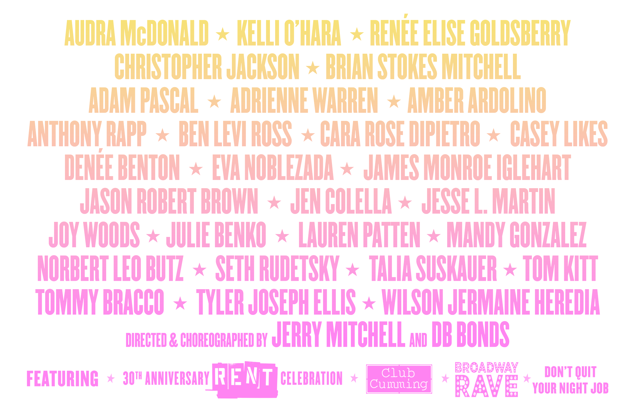 The Festival will include themed shows with your favorite Broadway talent singing songs you know and love them for, as well as songs you might not expect! There won’t be any full musicals performed (though our Rent 30th Anniversary Concert with original cast members will definitely be a highlight); expect to see great solo shows, themed-shows and tributes to composers you love, some of those composers in the flesh performing with members of our lineup, and each night culminating in a “Big Show” with an ensemble cast singing from the American Songbook and beyond, guaranteed to bring back Broadway memories and send you home humming.